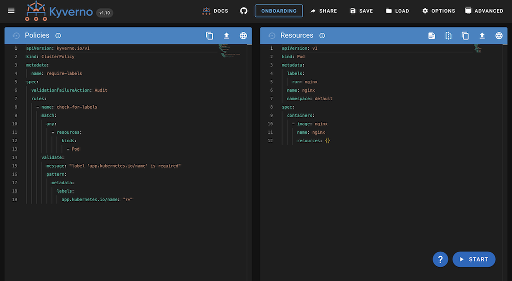 Kyverno Playground is a web-based and isolated test environment for Kyverno. It is a standalone binary and does not require connection to a real Kubernetes cluster, but is optionally supported.